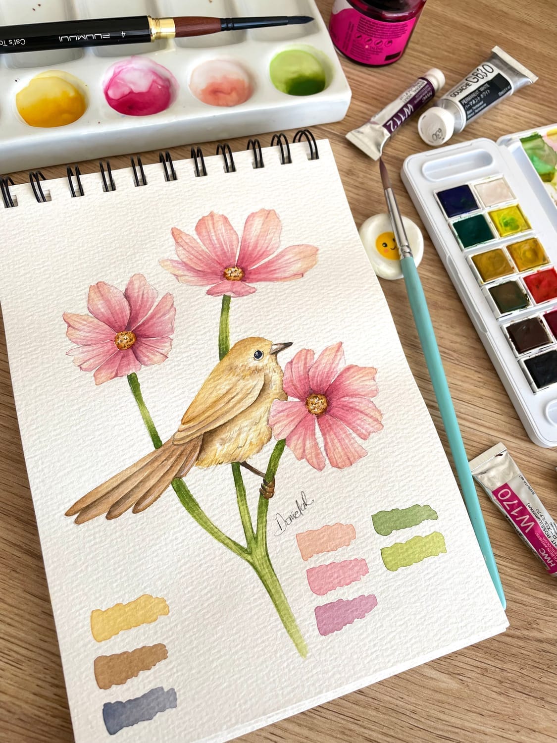 Cómo pintar un pajarito delicado entre flores de cosmos con técnica húmedo sobre húmedo para lograr transiciones ultrasuaves y plumaje esponjoso.